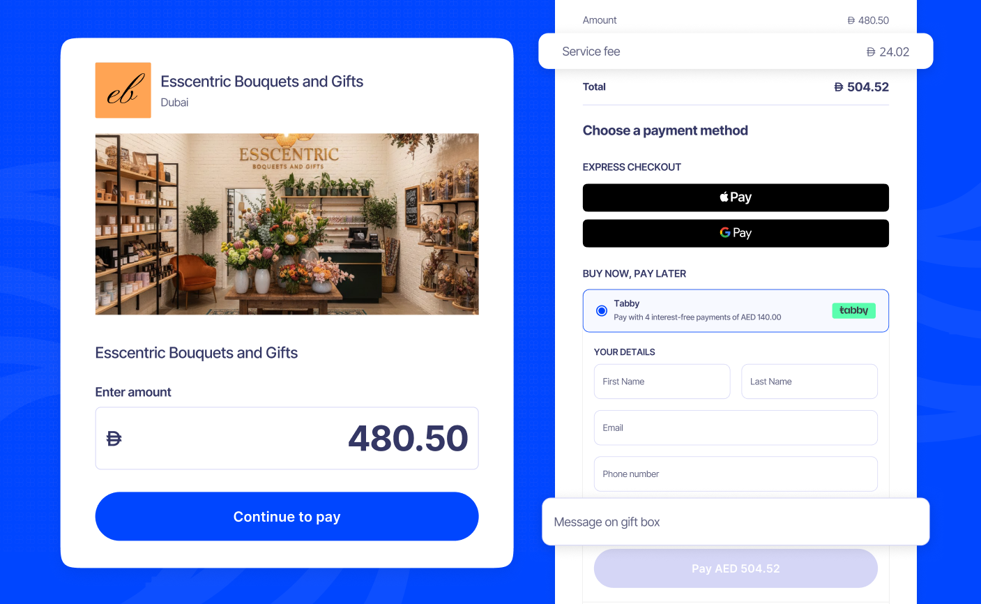 - If you enabled Service Fee, the fee is added to the amount when they select a payment method.