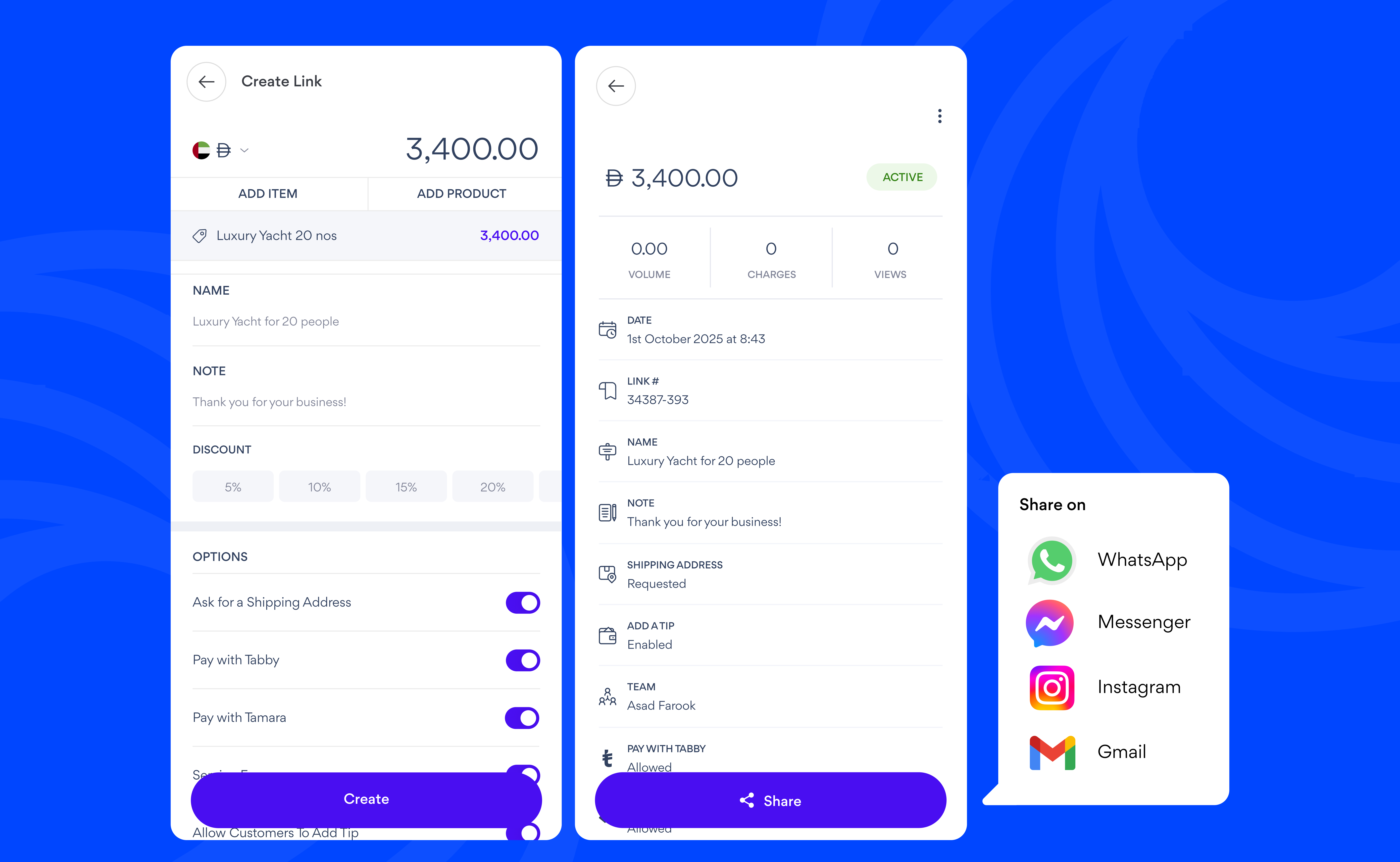 Use Link to collect payments remotely. Create a Link and share it over WhatsApp, Instagram, email, or any messaging app.