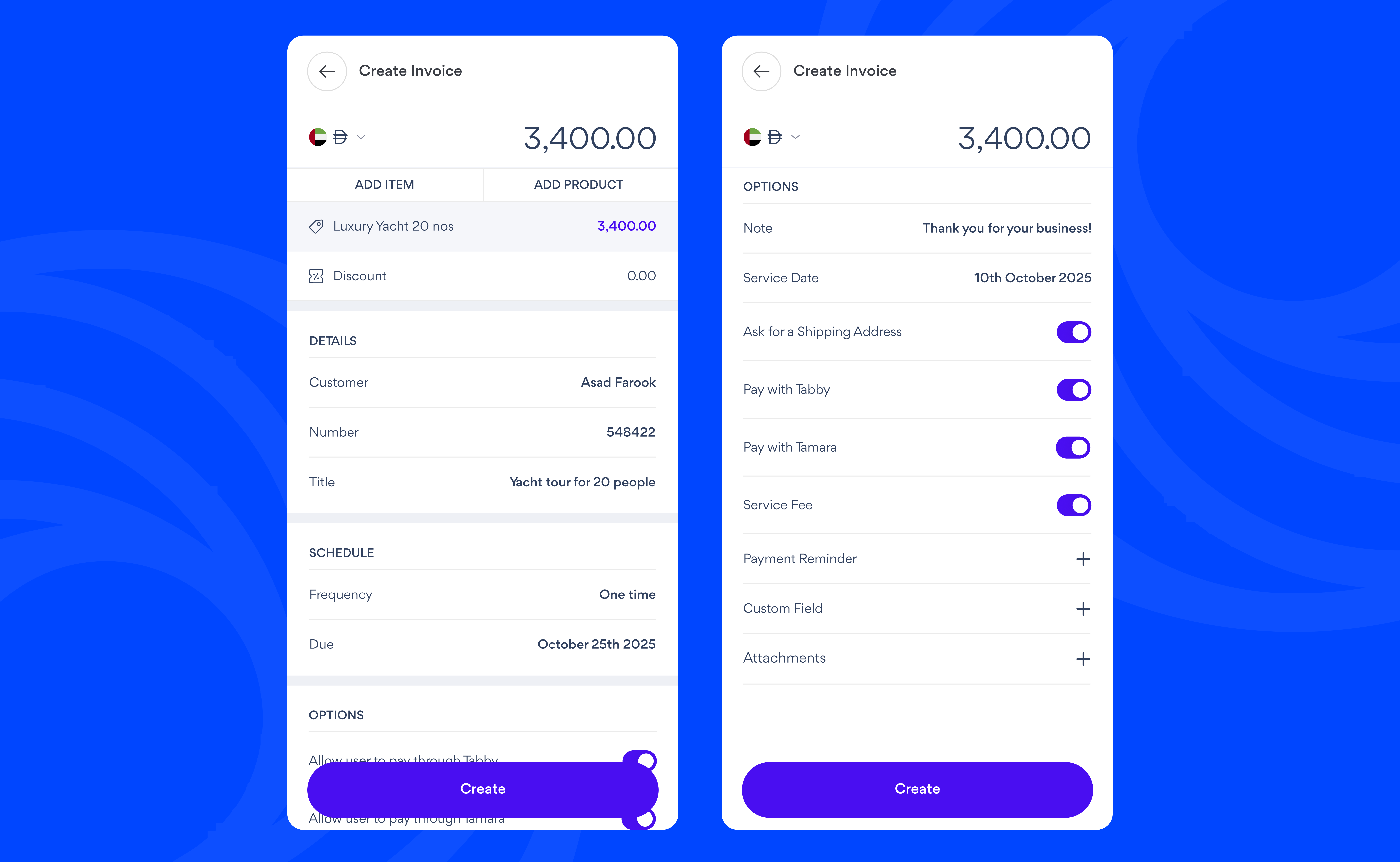 - Toggle Pay with Tabby and Pay with Tamara to control whether they’re available as payment options for this Invoice
