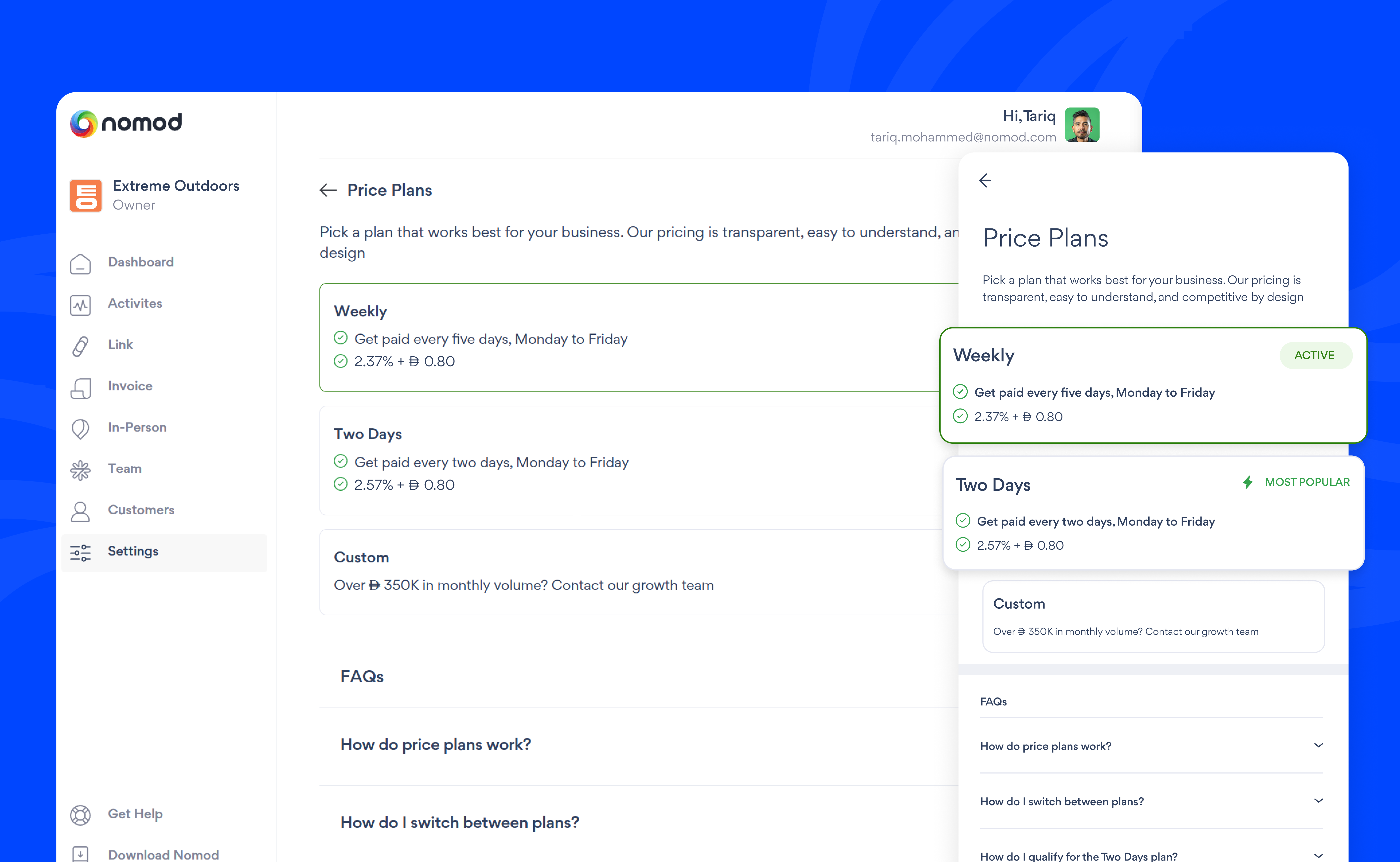 Select the plan that works best for your business. If you value competitive pricing and don't mind the extra wait, choose Weekly. If you value a quick cash flow, choose Two Days. Your price plan determines your payout speed.