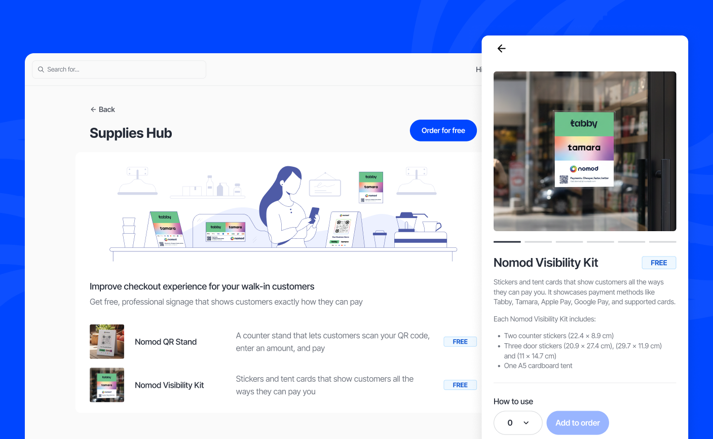 You can place orders for the Nomod Visibility Kit and Nomod QR Code Stand. You can order up to 10 units of each item per order, and all orders are completely free, including delivery.