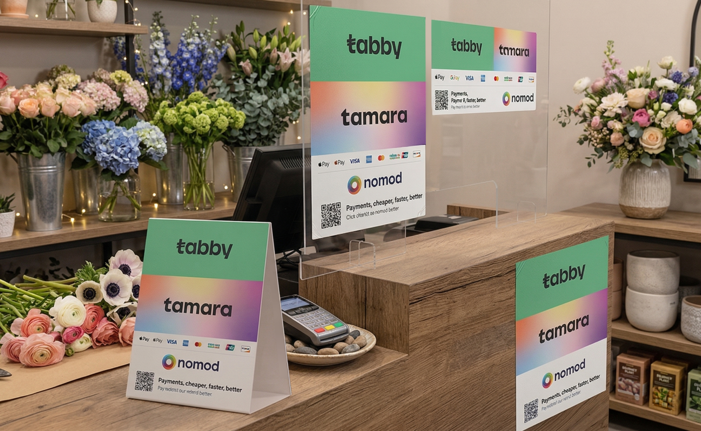 It showcases payment methods like Tabby, Tamara, Apple Pay, Google Pay, and major card networks.